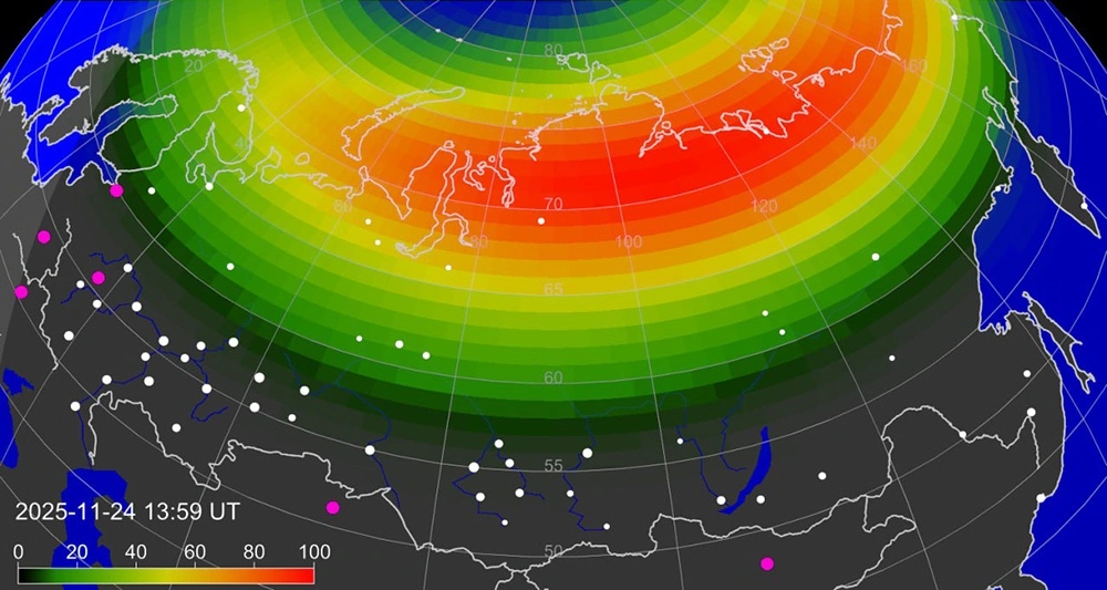 В восточной части Земли в данный момент происходит быстрый рост зоны полярных сияний. Нижняя граница этой зоны за последние 30 минут опустилась до широт около 55 градусов, что соответствует таким городам, как Москва, Казань, Нижний Новгород. Центр авроральной активности находится сейчас в восточной Сибири и через несколько часов достигнет центральных европейских частей России.
